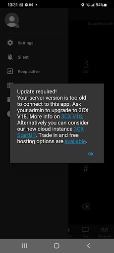 La versión 18 de 3CX es más rápida, más confiable y ofrece una experiencia de mensajería optimizada. Los usuarios de aplicaciones de Android que intenten conectarse a una instancia de V16 recibirán una notificación con enlaces para consultar más información sobre v18 y StartUP .