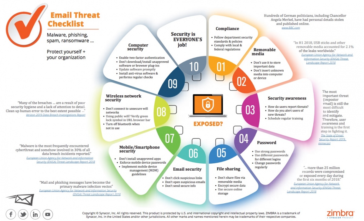 El equipo de Zimbra creó una lista de verificación de amenazas por correo electrónico que puede compartir con sus usuarios de Zimbra. Sus usuarios ya deberían conocer la mayor parte de esta información, pero un recordatorio siempre es bueno.